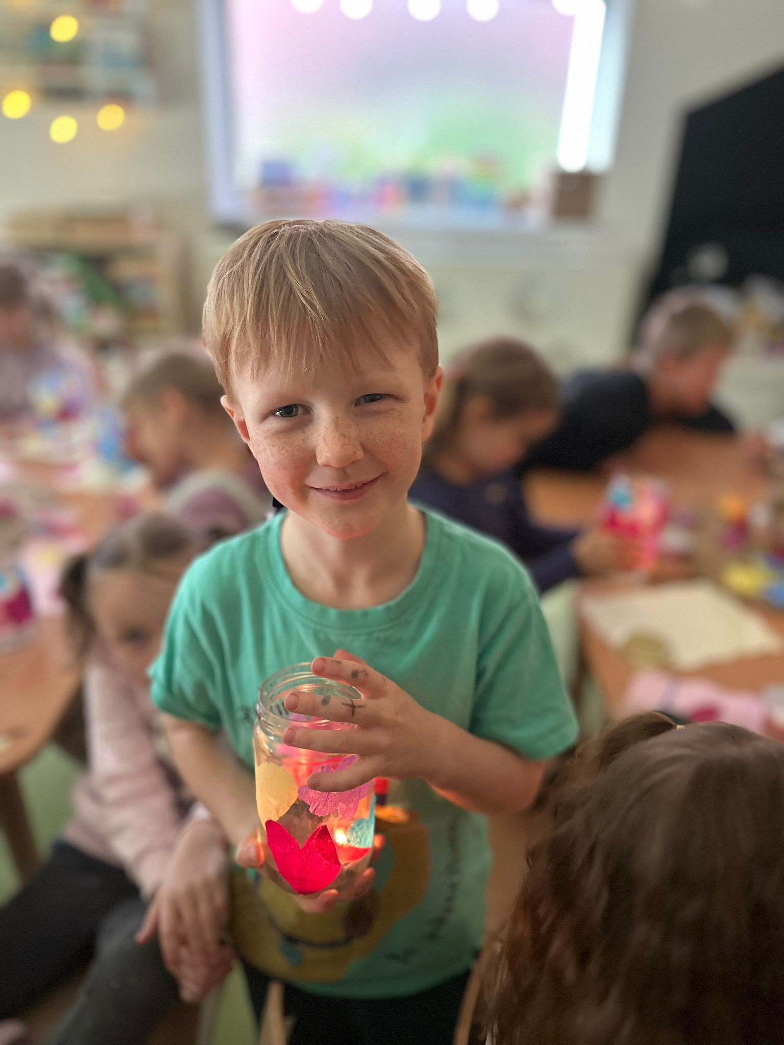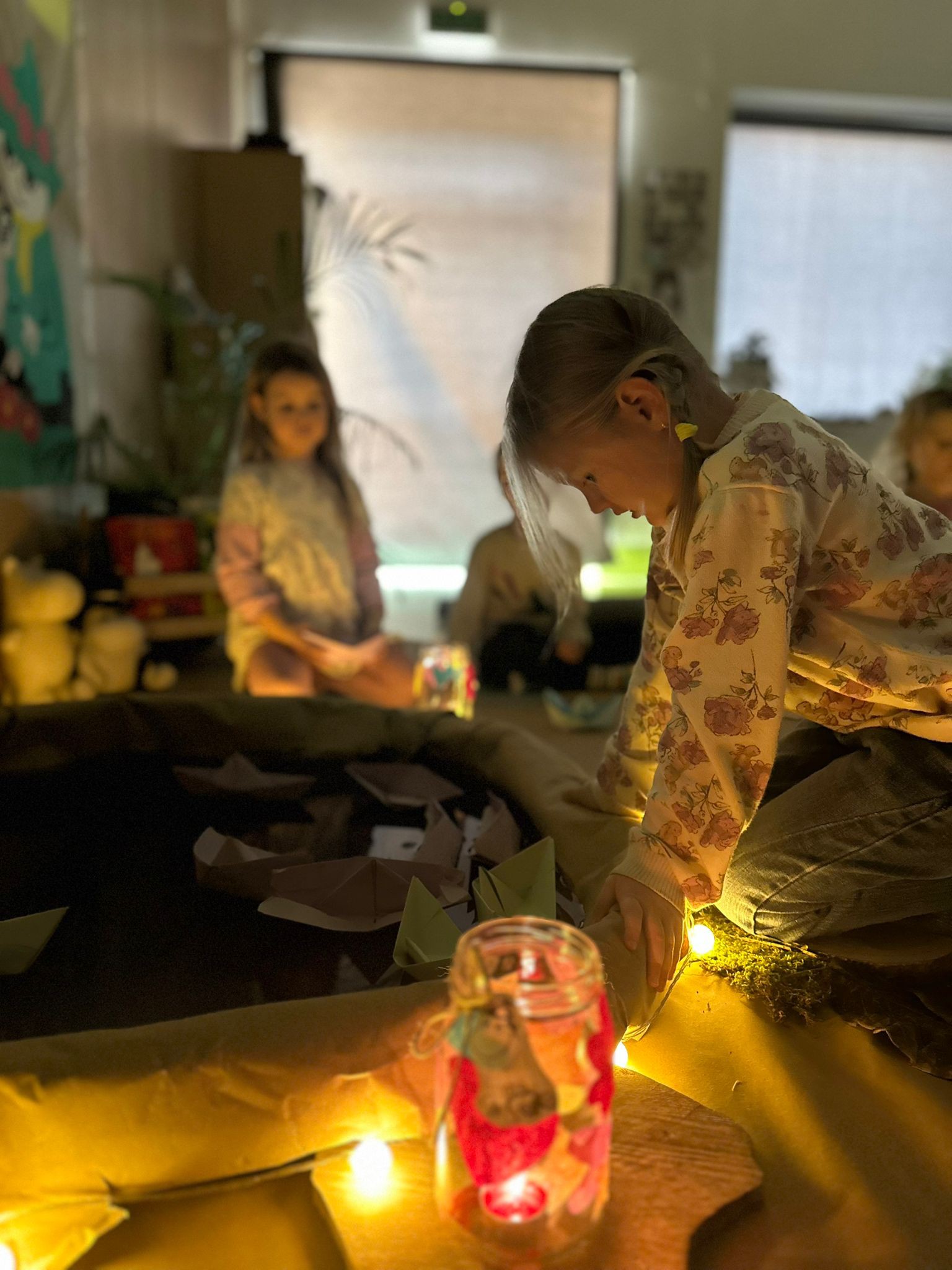 Dzieci wykonały własne kolorowe lampiony, które pięknie rozświetliły salę.