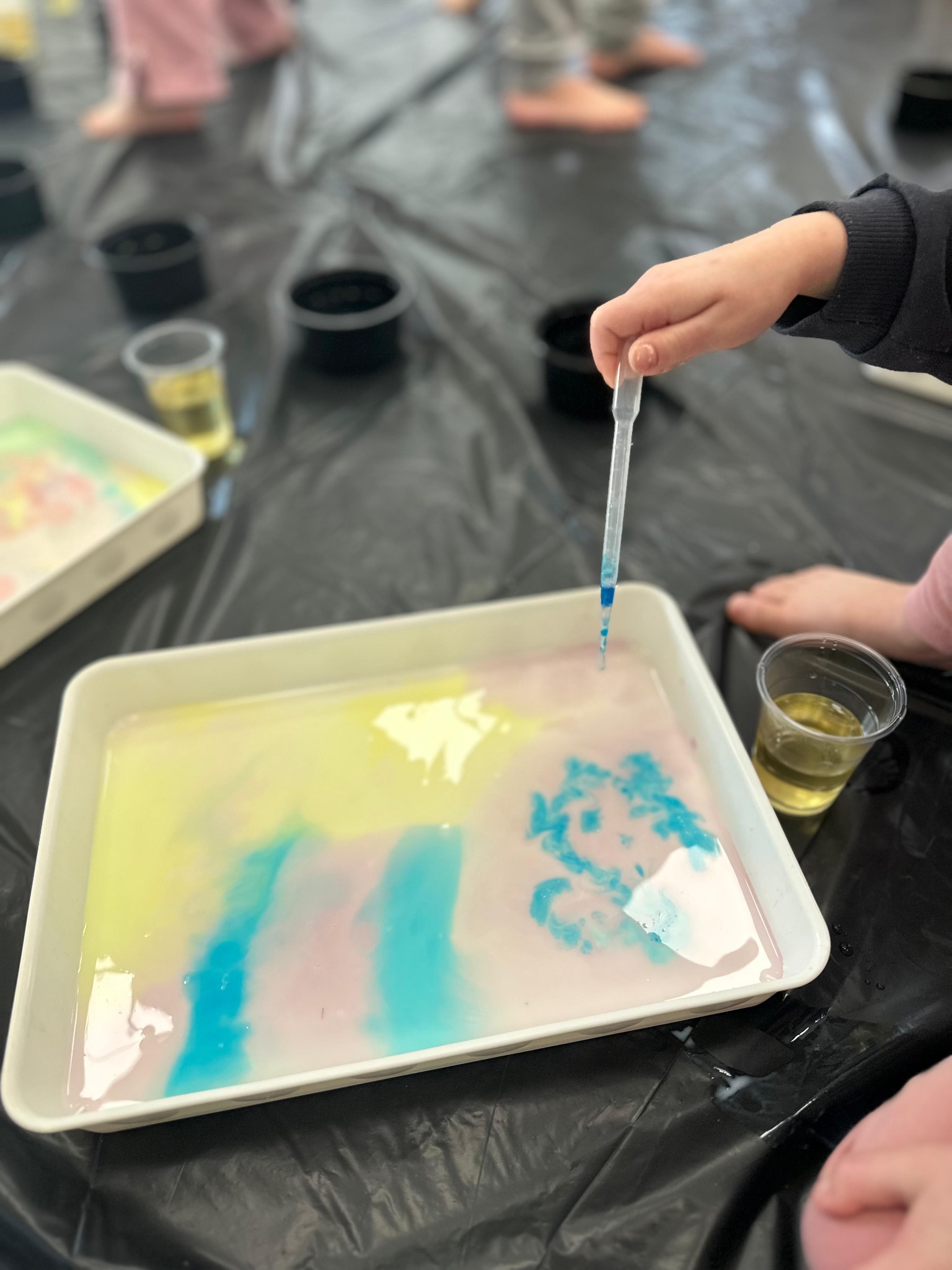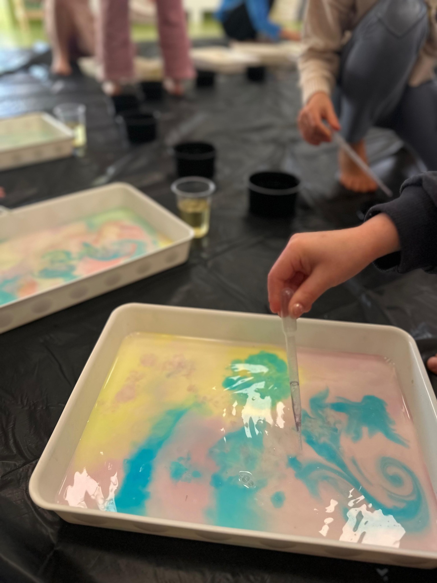 Ostatnio nasze Kluseczki i Groszki wzięły udział w kolorowych zajęciach z sensoplastyki. Dzieci eksperymentowały z barwieniem mleka przy użyciu barwników spożywczych i oleju, obserwując, jak kolory mieszają się, „tańczą” i tworzą niezwykłe wzory. Było mnóstwo radości, zaciekawienia i twórczej zabawy! 🌈✨